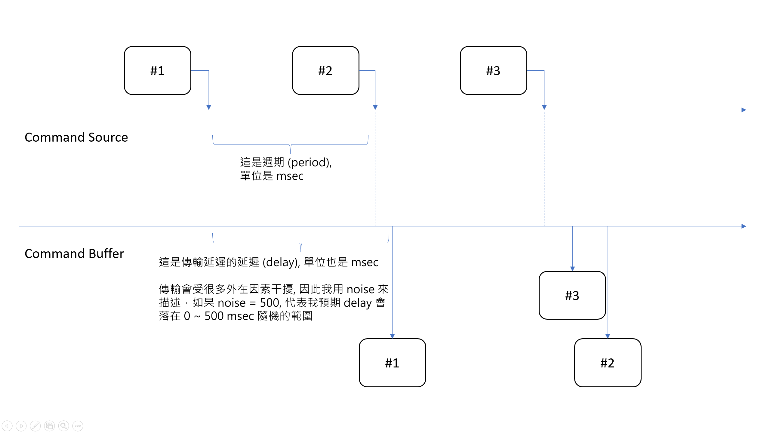 每個 Command 要標示順序 (Position), 預設從 0 開始編號, 一定會是連續流水號。除了標號之外也要標示來源端發出時間 (Origin), 以及模擬網路傳輸,可能造成的隨機延遲 ( 0 ~ {command_noise} msec ) 標示實際收到的時間 (OccurAt)。最終 GetCommands() 傳回的順序,會按照 OccurAt 來排列的,而不是 Origin (意思是會考慮傳輸的隨機延遲後真正收到的順序), 因此你要在後面的階段 (Command Buffer) 想辦法把錯亂的順序修正回來。修正過程中可能會有些狀況,因此你必須盡快的辨識出哪些 Command 能正常送出 (SEND),那些已收到的 Command 必須被丟棄 (DROP),那些應該收到但是遲遲未收到的應該被略過 (SKIP)。