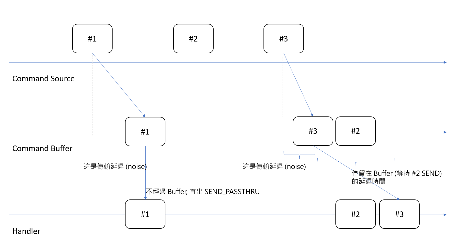藉這機會,用前面這張圖延伸說明一下 Delay. 以這案例, #1, #2 會直接送出 ( SEND_PASSTHRU ),不會再 Buffer 停留 (頂多就 0.x msec 處理時間而已)。但是因為 noise 的關係,#3 比 #2 還早送到 Buffer, 因此 #3 會被暫存放在 Buffer, 等待 #2 已經 SEND 出去後,才會一起把預先放在 Buffer 的 #3 一起 SEND_BUFFERED 出去。