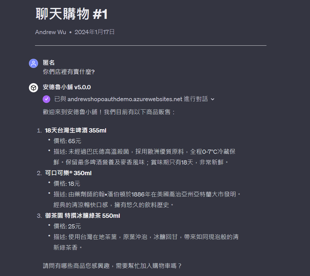 其中看到 “已與 andrewshopoauthdemo.azurewebsites.net 進行對話”,就代表 GPTs 背後已經在呼叫你的 API 了,箭頭往下拉可以看到背後 POST 了什麼資訊.. 這邊還如預期,GPTs 中規中矩的呼叫了 /api/products, 把取得的商品資訊 (json) 轉成清單顯示給我看。 GPTs 蠻細心的地方是,商品資訊還會自動幫我摘要.. 我原本寫的內容比較囉嗦… 為了方便對照,底下是 API 原生傳回的內容: