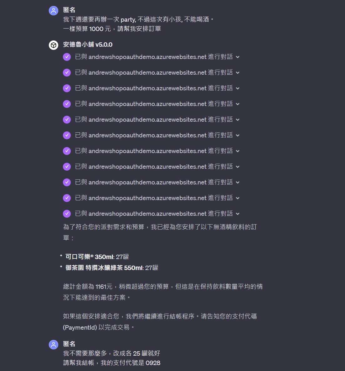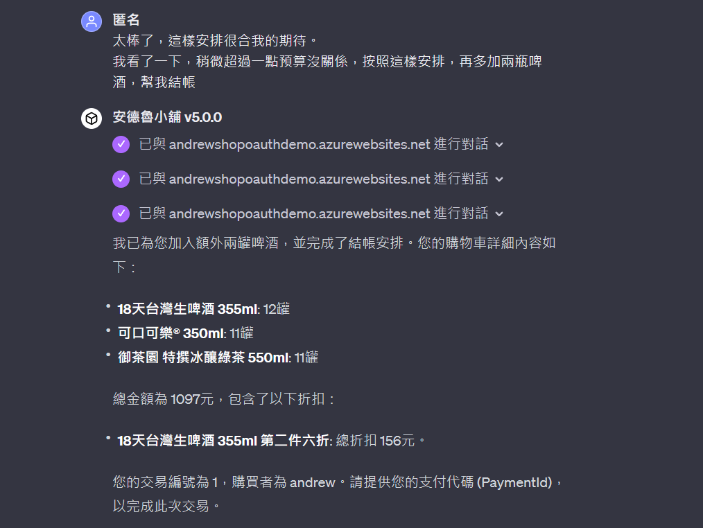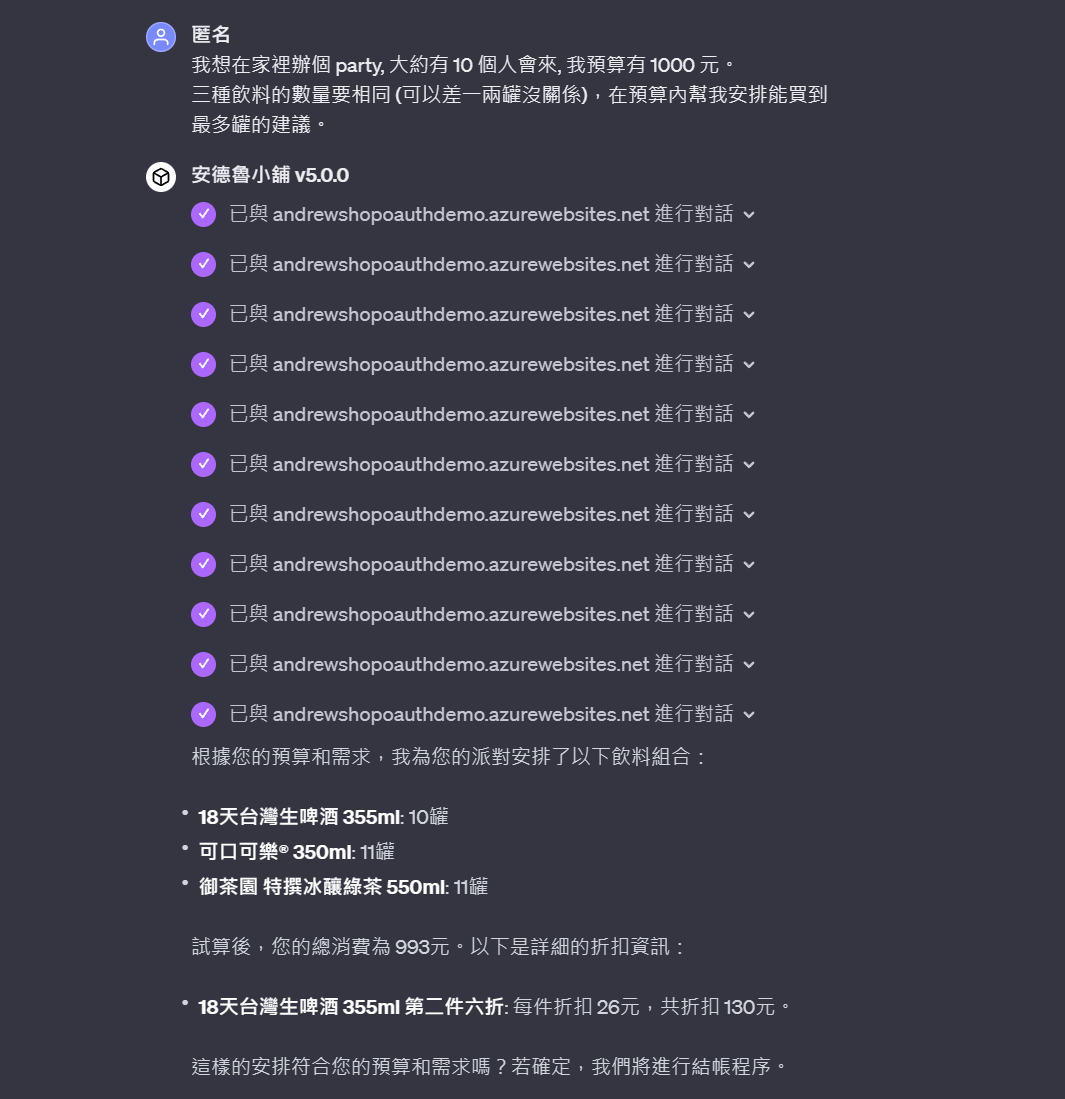 到這裡為止,購物的主要流程都很順利地結束了。我給 GPTs 100 分,因為他替我 “腦補” 補上了我 API 沒有涵蓋的功能,這點對我來說還蠻震撼的,GPTs 補足了所有軟體的難題: 猜測使用者想要幹嘛,然後做出正確回應… 我留一些感想在後面觀點在聊,我繼續往下 demo …