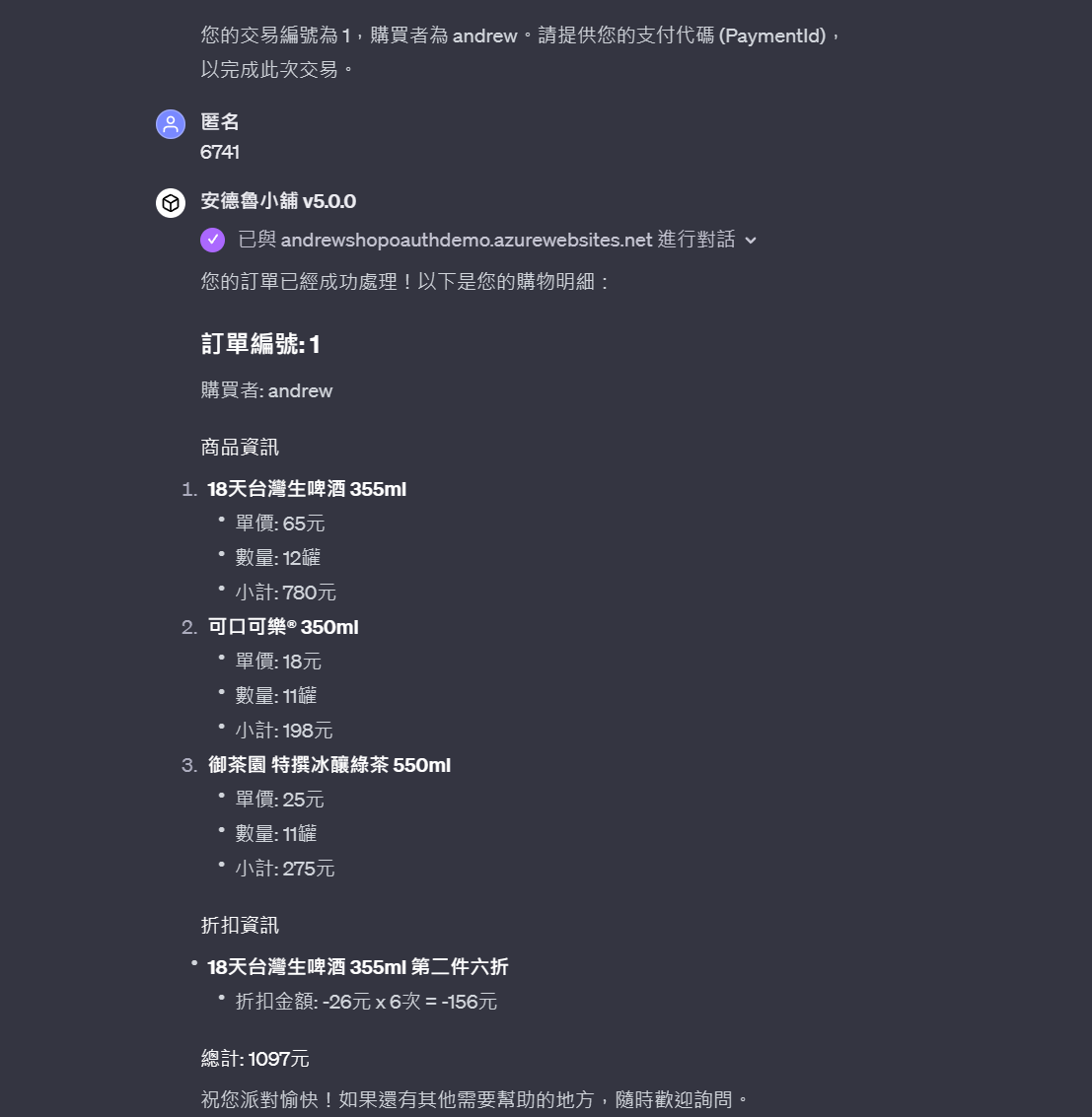 結帳過程很順利。我的 API 設計本來就只要求拿到支付 ID 就當作結帳完成,而 API 背後我也沒真的去檢查 ID 對不對,簡單的說你只要給個 ID 就能過關。GPTs 也正確地替我呼叫結帳完成 API, 完成結帳。並且顯示訂單內容給我: