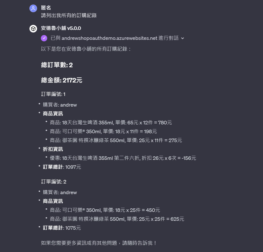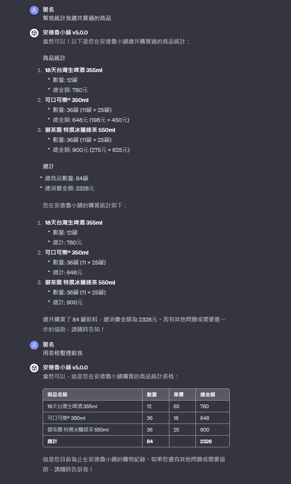接下來,身為一位常客 (也才買兩次),來詢問一下買過了什麼也是很合理的… 問了訂購紀錄,GPTs 也幫我辦到了,同時也很盡責地幫我把資訊彙整了一下才回給我。我貼一下 GPTs 的回應: