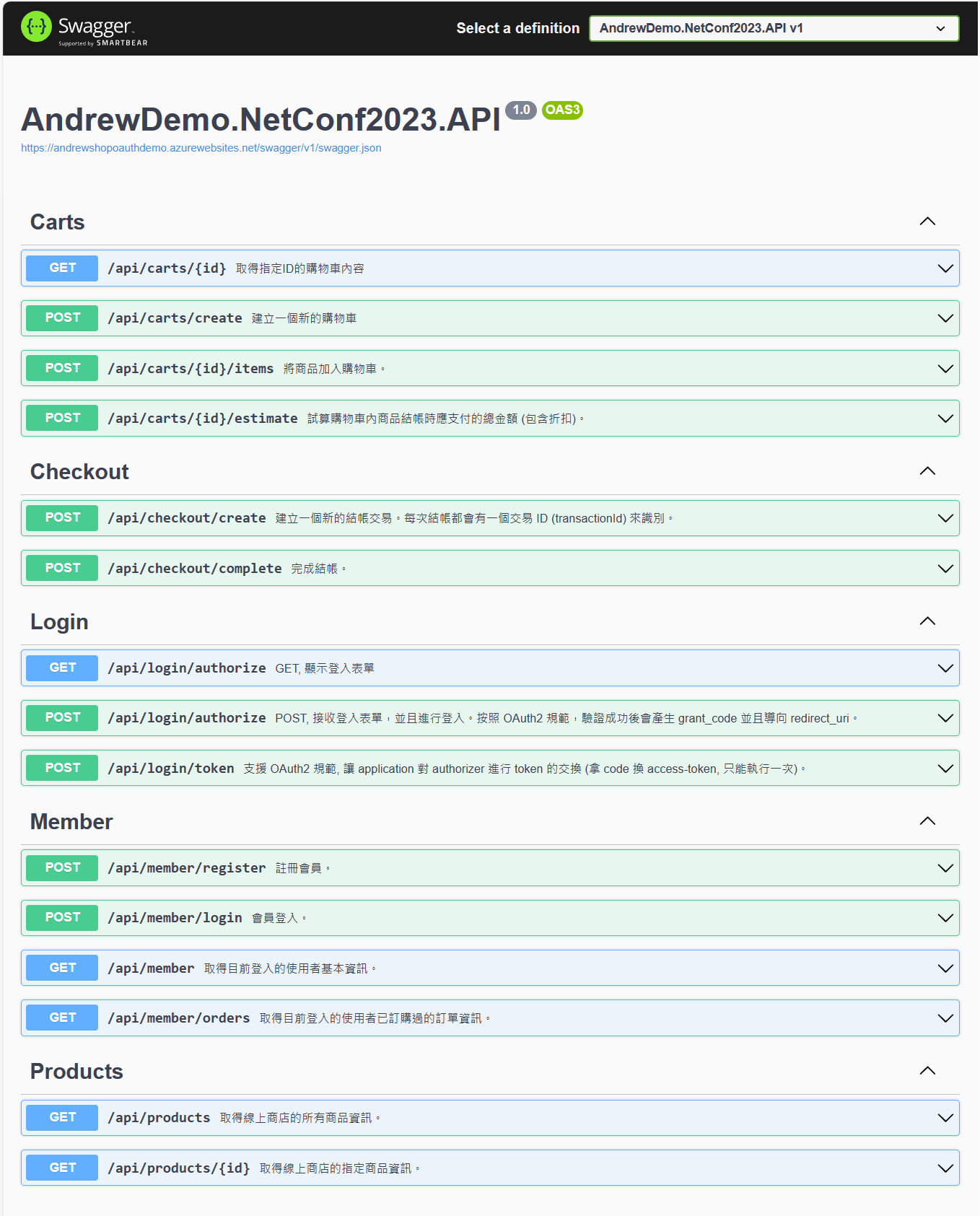 - 技術細節,可以直接看我這次開出來的 購物網站 API 規格