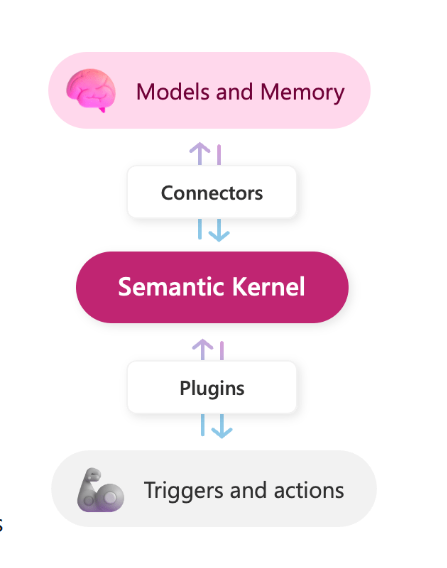 看懂 Semantic Kernel 的這兩張圖就夠了,這張講的是 AI infrastructure / models 與 Plugins / Copilot 之間的協作,Semantic Kernel 就是扮演把這些全部串在一起的框架。如果 安德魯小舖 GPTs 我用 Semantic Kernel 改寫成單機版,那麼我的 API 就是圖上的 Plugins 了,我不管用什麼技術刻出來的 UI,就是對等 Copilot 的位置了。而不論我是跑本機板的 LLM,或是使用 cloud 的 AI service, 我用 connector 串聯它們,就是底下的 foundation models / AI infrastructure 了