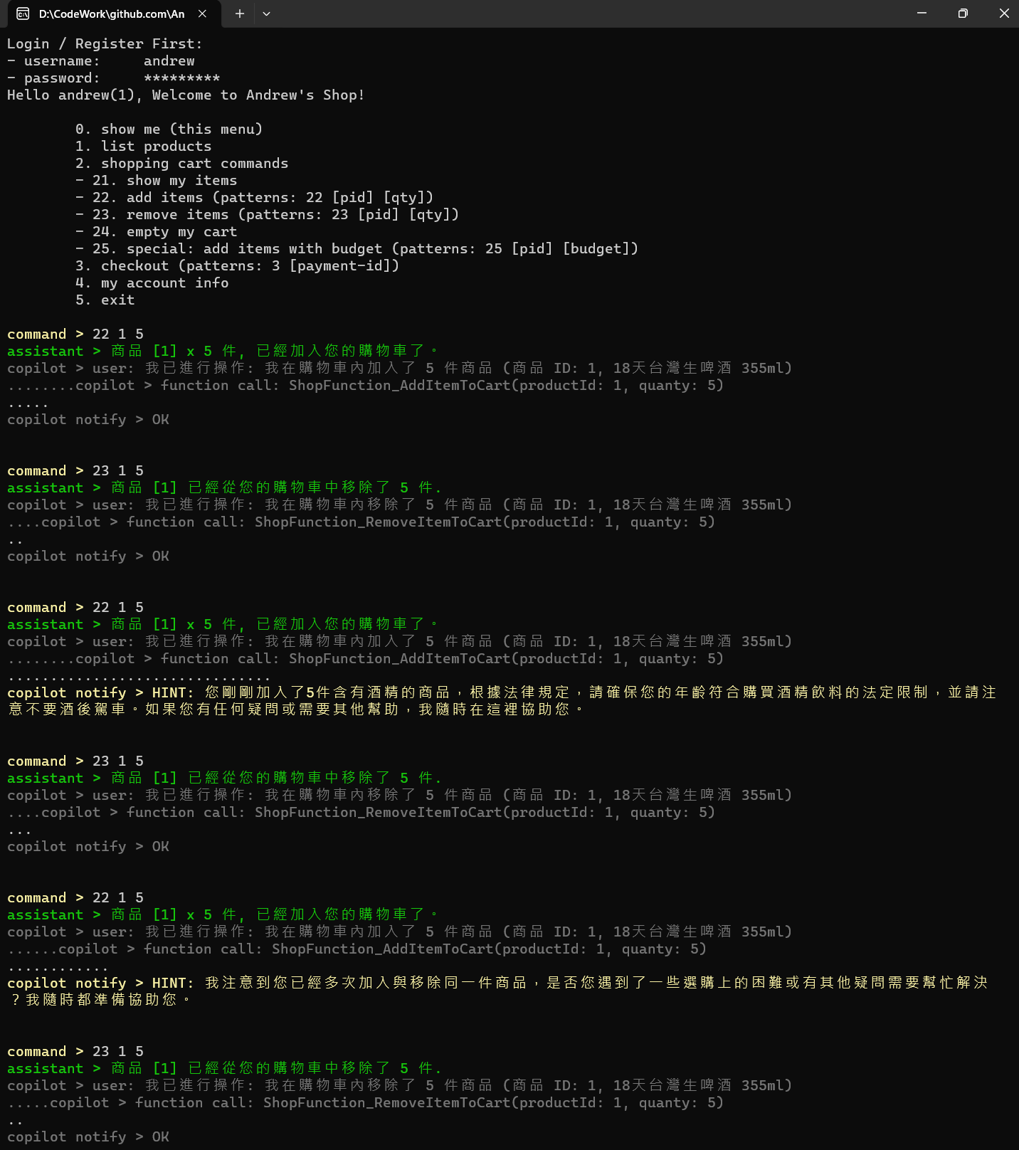 這是我第一個嘗試,我不再是整個購物流程都靠 AI 來進行了,而是在正常的操作流程中,靠 LLM 來處理關鍵需要 AI 判定的任務。而 prompt 的決定,也改為 developer 事先準備好。這樣的操作,你需要的不再是 Chat GPT, 而是需要在應用程式內使用 Open AI API, 搭配 AI 的開發框架 ( 我用 Semantic Kernel ) 來達成。