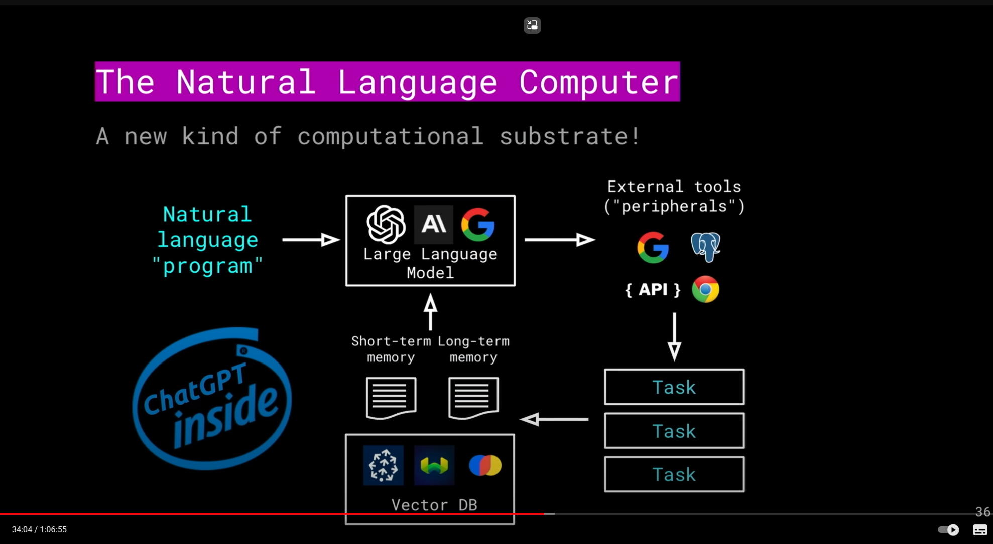這邊的關鍵是: 自然語言 (prompt), LLM, API, Task (Orchestration), Vector DB, 其實講的就是前面列的幾個主要元件的組合啊。再看看 Semantic Kernel 相關的介紹 ( 我找到一篇 Build 2023 的場次 ) 就更貼切了: