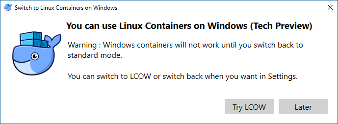 沒想到 1709 出來後,要用 LCOW (Linux Containers on Windows) 這麼容易啊… 裝 edge channel 的版本 (17.10.0-ce-win36(13788)) 以上的版本就可以啟用了…
