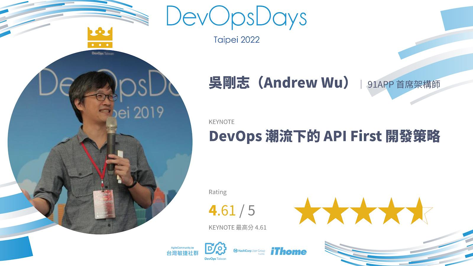 l 畫面投影片一直用聚焦導致畫面閃爍眼睛不適 l good有很多實務上的分享 l 了解現行的開發模式 l 邏輯清晰條理分明 l 有很多實務上的分享 l 建議PPT可以先公開,內容太多,或者在agenda推算導續 l 實際案例分享,且有提出普適性的見解 l 講好快全部都是重點 l 會期待下次再聽Andrew分享 l 感謝提供簡報 l 理想很多,實例上感覺還是會衍生許多問題 l 想去91app工作了!!想聽鬼故事的部分。 l 內容豐富 l 有料! l 非常好!!! l 對於Backend開發人員受益匪淺! l 收穫豐富 l 很實際可看出API First的實作流程 l 看到大神本人印象深刻 l 多點案例 l 精實!讚 l 充分的了解API First 的開發為何 l API治理與大批次寫入要求的應對,長服務鏈如何解決失敗Rollback,切割強一致性來配合狀態變化 l 內容很豐富很用心,但建議演講時語調可以多點抑揚頓挫會更優