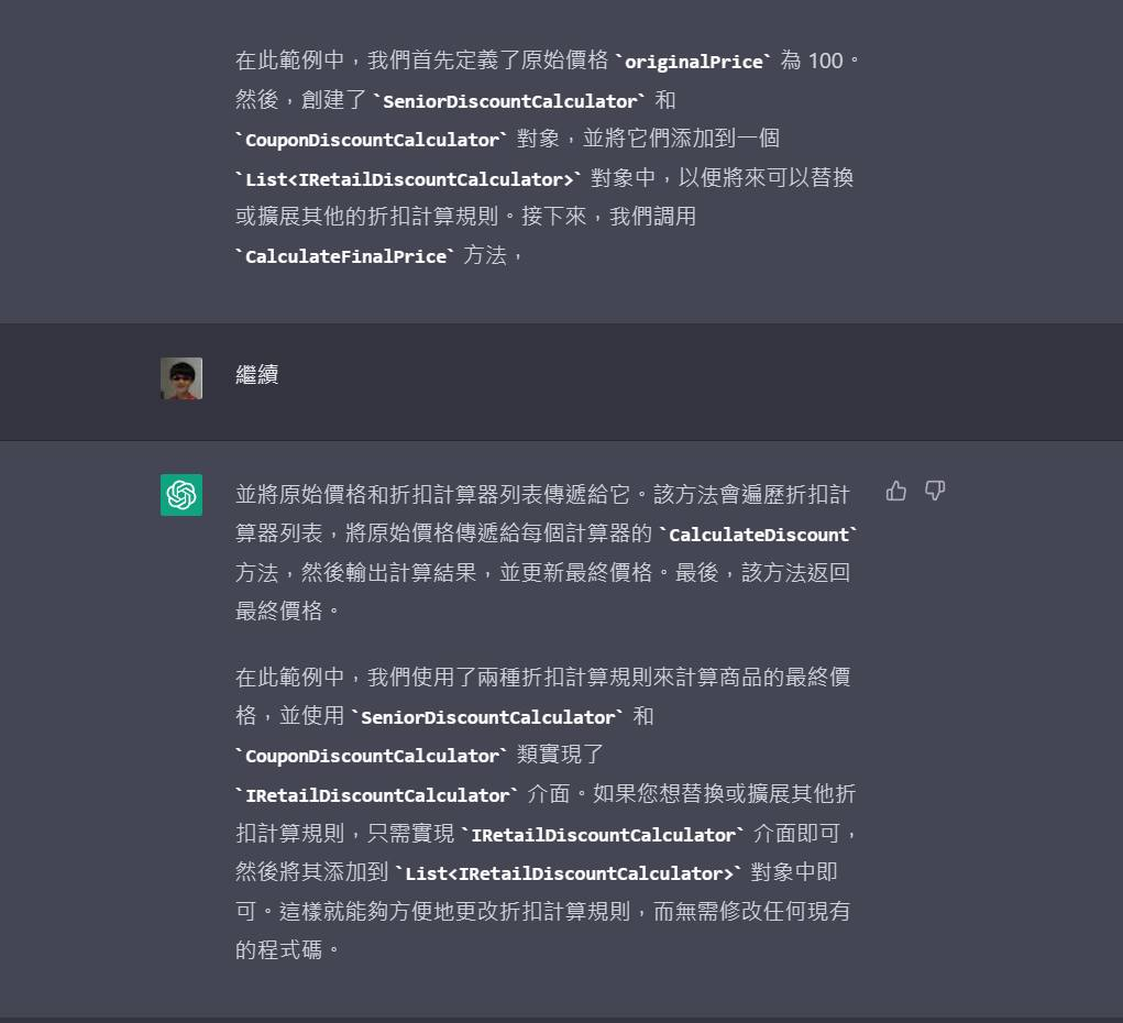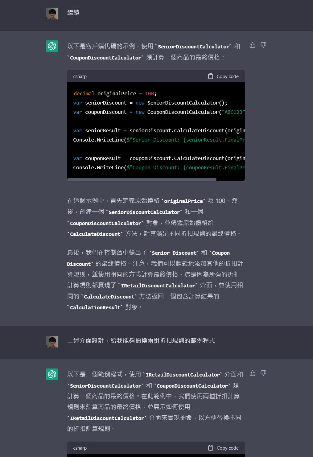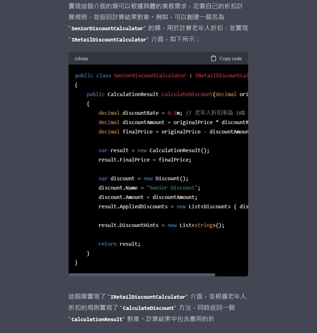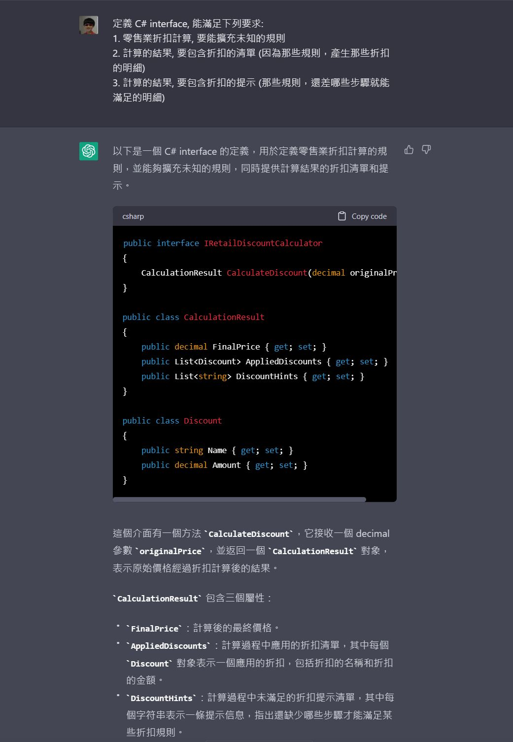 整個前後文只有三句話,但是 ChatGPT 卻已經回給我我那篇文章解法的關鍵部分設計了。雖然整個 code 的設計不如我寫的精巧,但是關鍵設計結構已經出來了啊! Interface 只有一個 method, 精準的表達 input (原始價格, 我的版本是整台購物車, 這裡只是一個數字) 與 output (折扣計算的結果, 足以輸出收據明細的內容, 包含最終金額、折扣清單、以及提示清單)。