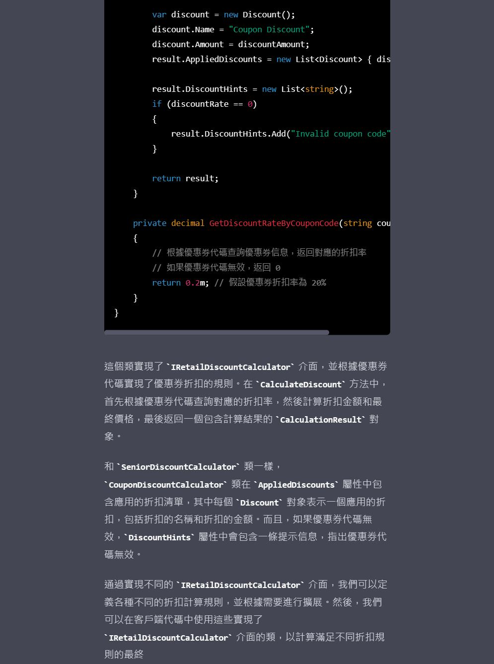 同樣的,範例程式並沒有我寫得漂亮 & 精巧,但是同樣的,已經把主要的問題解決了啊,至少他充分的展示了怎麼正確的使用這 interface 來計算折扣 (抽象化後的主流程),也充分展示了怎麼正確的擴充(實做) interface 來插入未知的規則。