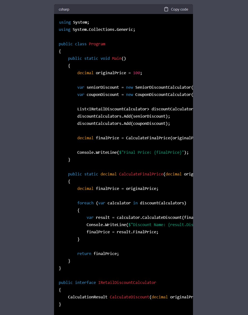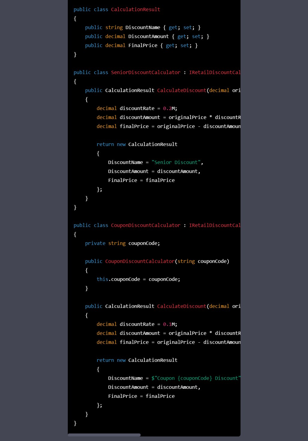 public class SeniorDiscountCalculator : IRetailDiscountCalculator { public CalculationResult CalculateDiscount(decimal originalPrice) { decimal discountRate = 0.2M; decimal discountAmount = originalPrice * discountRate; decimal finalPrice = originalPrice - discountAmount;