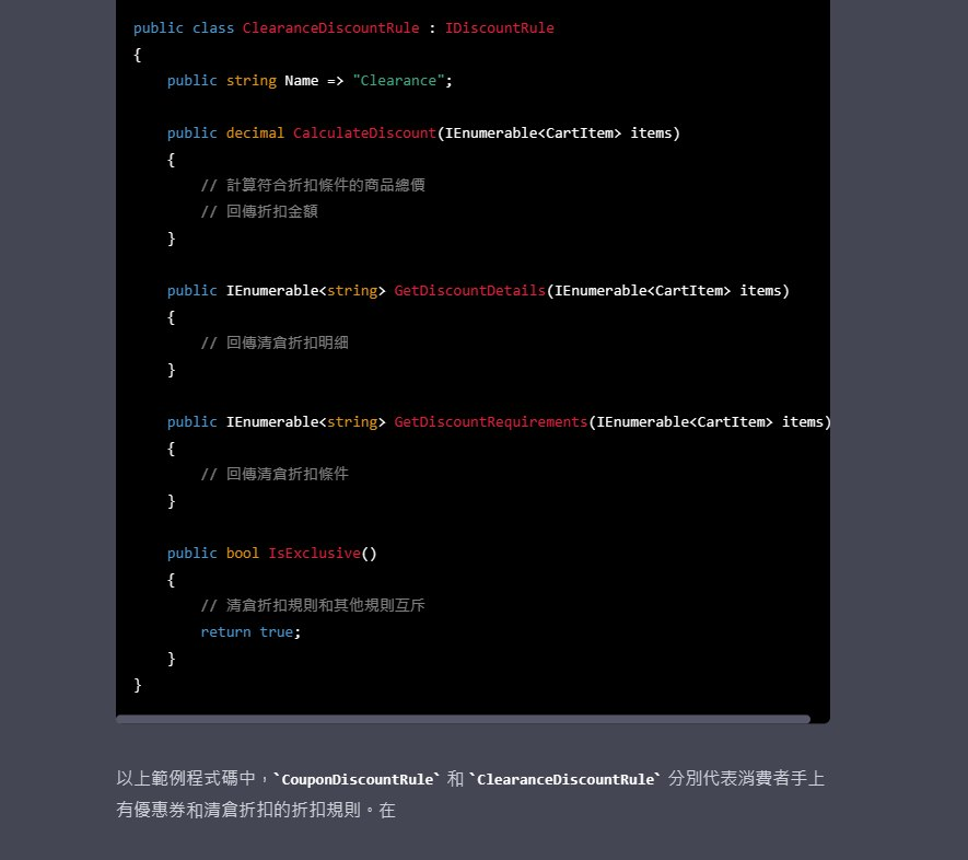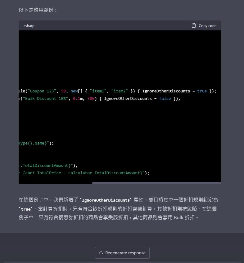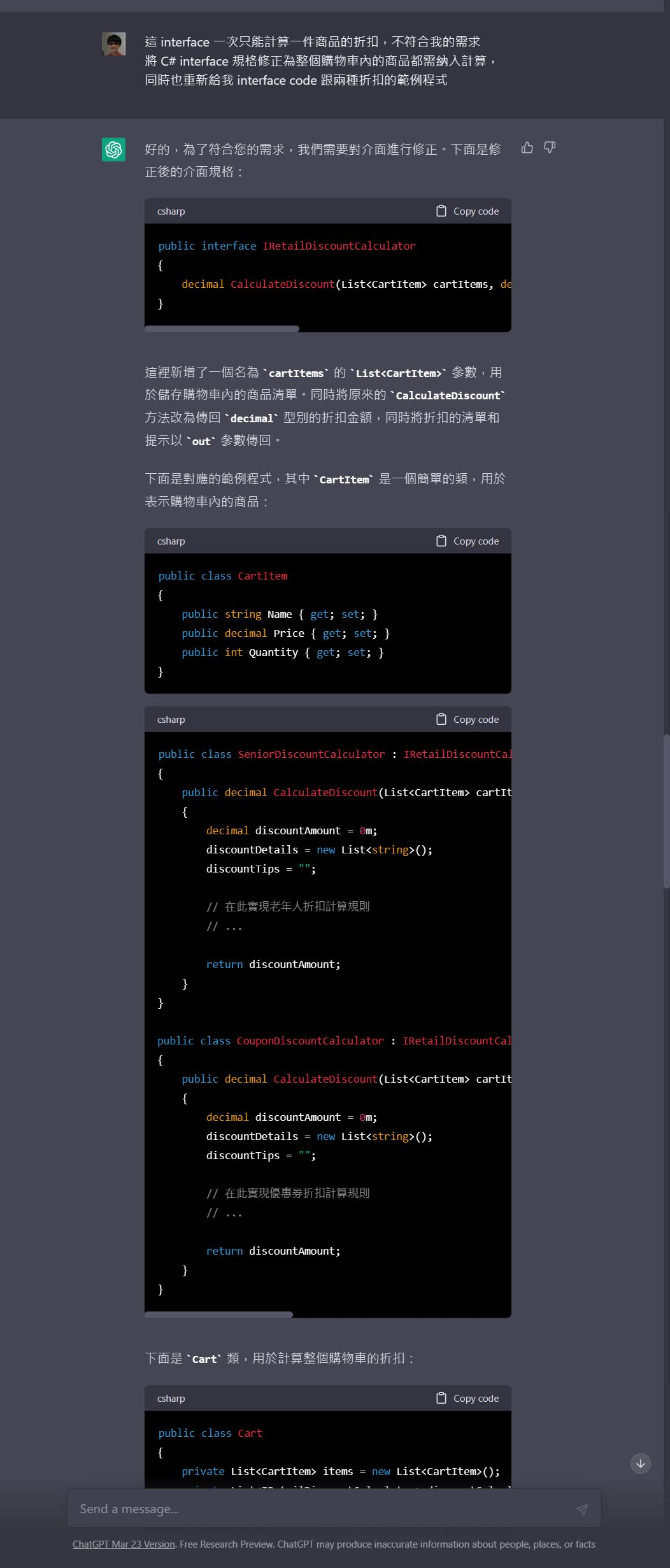 (前情提要: 我只問了兩次,短短三個要求,ChatGPT 就已經給了我折扣計算的抽象化界面 跟 同時支援兩種折扣活動的範例程式碼)