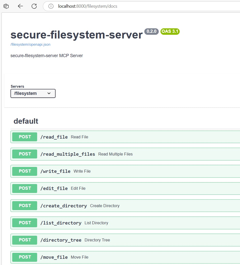 我如果把 mcp filesystem 掛上 mcpo ( 可以直接用 claude desktop 的 json config, 參考圖一 ), 你就可以從 http://……/filesystem/docs 看到 swagger UI (圖二), 整個 /filesystem 就是一個可以正常運作的 rest api server 了..