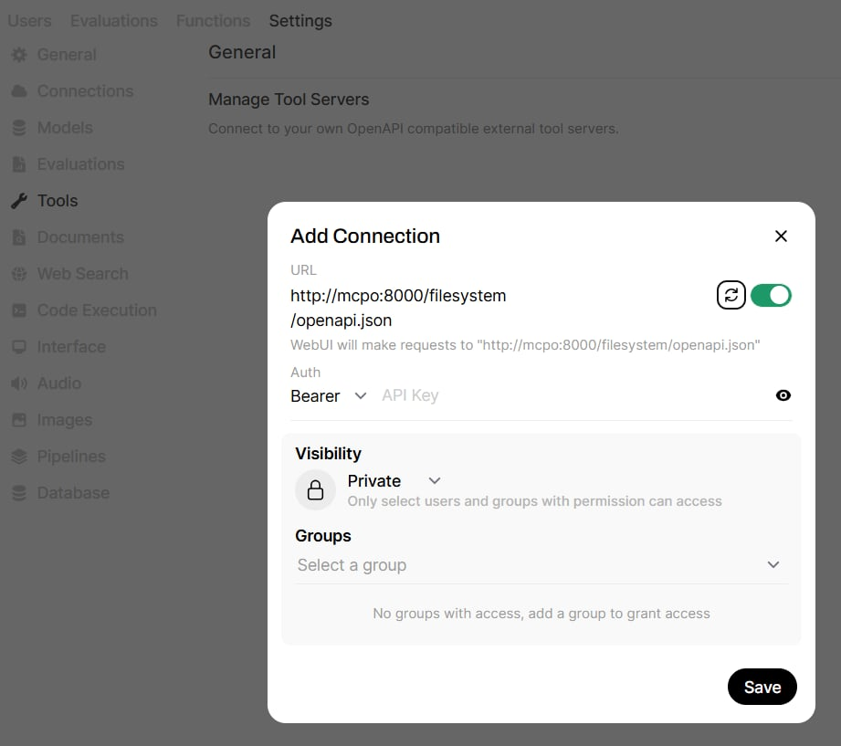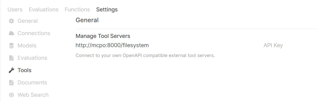 而 open-webui 也走這路線, 在 settings 畫面你可以直接指定 api endpoint, 只要符合 open api spec 就能掛上去使用。我猜 open-webui 本來也是跟著 open ai 走, 結果三月底 open ai 宣布要支援 mcp, 於是也跟著倒戈了 XDD, 我猜 mcpo 就是這樣來的。