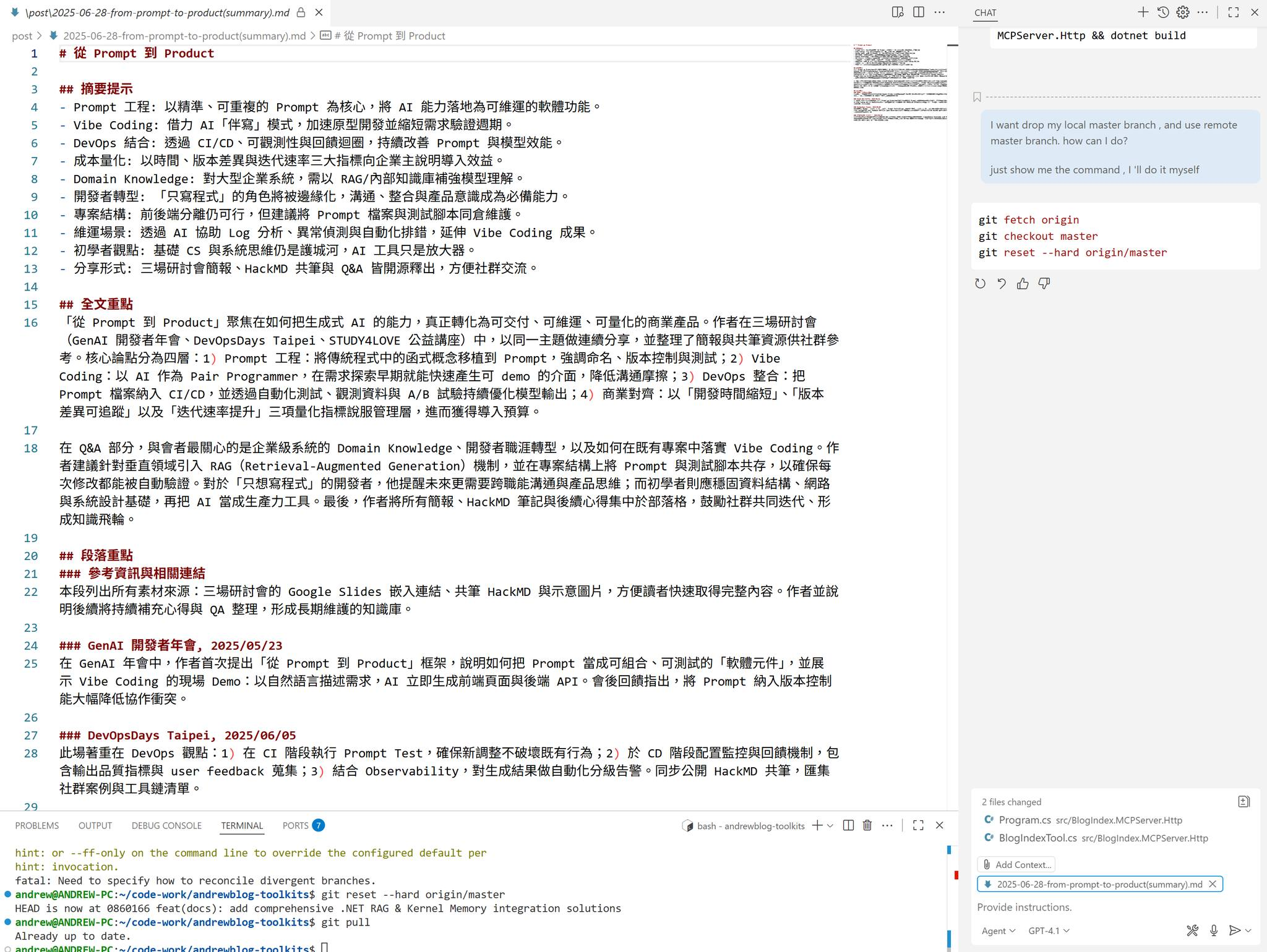 對 MCP 各種能力的支援,第三方其實做的好太多了啊啊啊啊… 換掉 Claude Desktop, 改用 VSCode + GitHub Copilot, 狀況就完全不一樣了… 當我在 Agent 那邊點選 Add Context, 來源選 MCP Resources … 不但每篇文章的 Uri + Title 正常顯示, Auto Complete 也正常運作, Resource Template 也正常支援.. Orz (影片3)