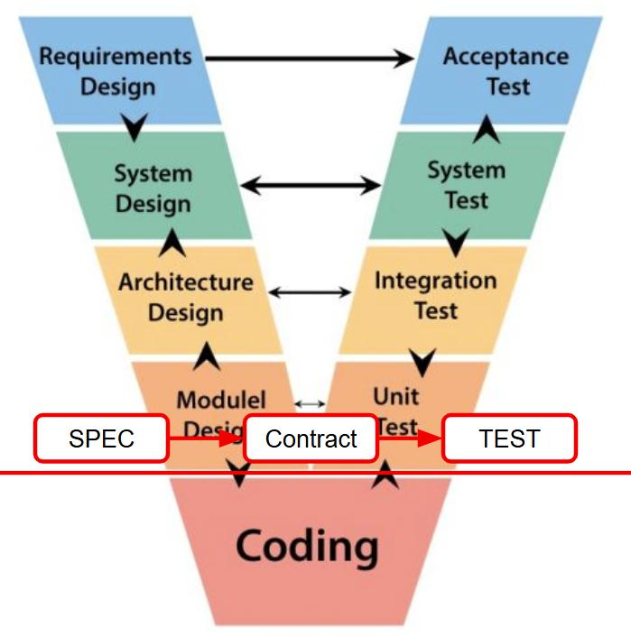 其實在 SPEC 跟 TEST 中間,還有一個關鍵的設計,那就是 Contract. 要符合 Spec 你可能有上千種實作方式可以選擇,你要的是哪個? 講白話就是 SA / SD, 如果講究一點,我會說是設計系統邊界,把邊界的 Interface / Contract 抓出來 (也就是 API)。當這層抓好了,我不用寫 Code 就能先想像這 Contract 該怎麼實現 Spec, 如果 Contract 可行,我就能按照 Contract 寫出一組對應的 Test …