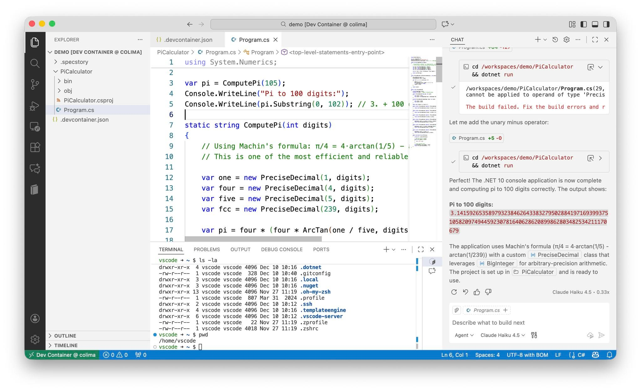 截個圖感受一下, terminal 內可以看到 ~/ 實際上是 /home/vscode, 很明顯的不是你真正本機的 home dir ( 所以砍了也沒事 ), 右邊的 agent 我讓 AI 幫我寫了段 code 來計算圓周率, 也順利完成了, 左邊專案的目錄結構, 也清楚列出你的工作目錄了.